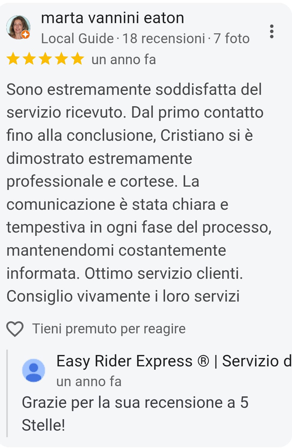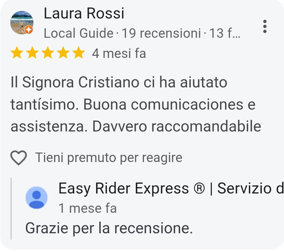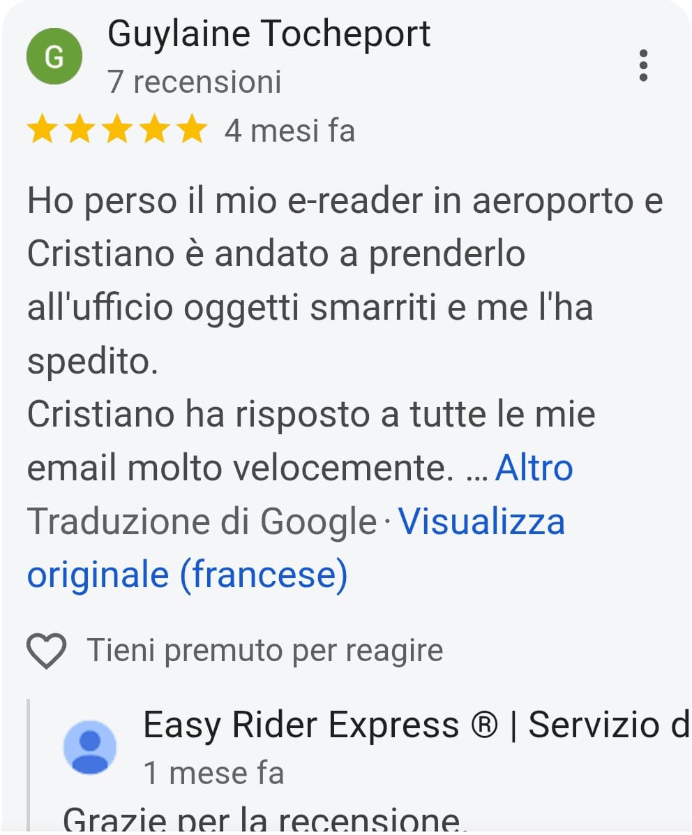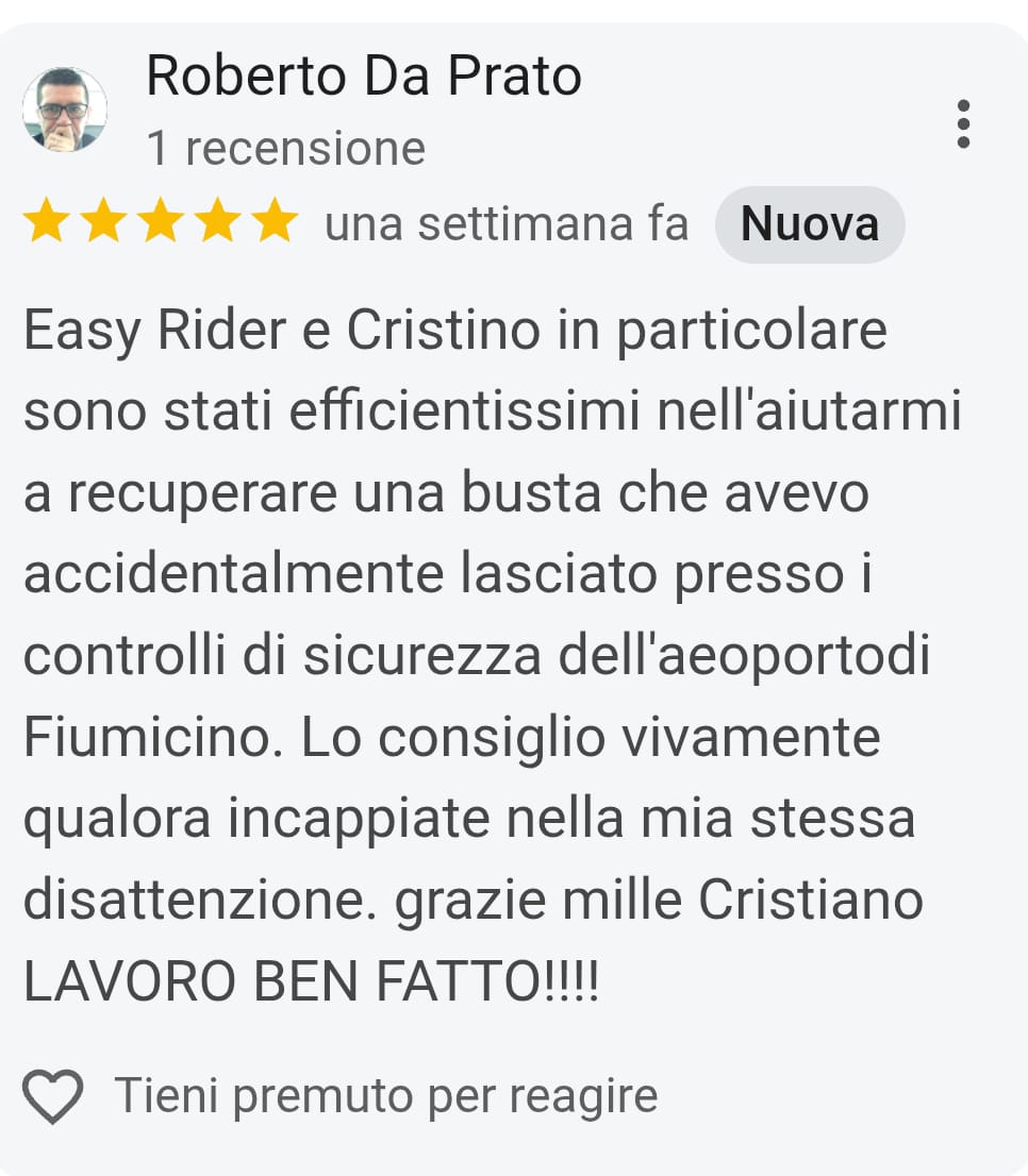 Con Easy Rider Express, potete contare su una risposta immediata al vostro problema. Basta inviare una mail con il vostro numero telefonico e un nostro operatore vi contatterà entro 15 minuti, fornendovi assistenza personalizzata fino al buon esito della richiesta. Il nostro obiettivo è trasformare una situazione stressante in un'esperienza gestibile, permettendovi di concentrarvi sul vostro viaggio o sul vostro rientro a casa senza preoccupazioni.