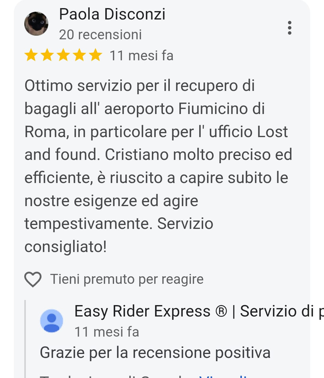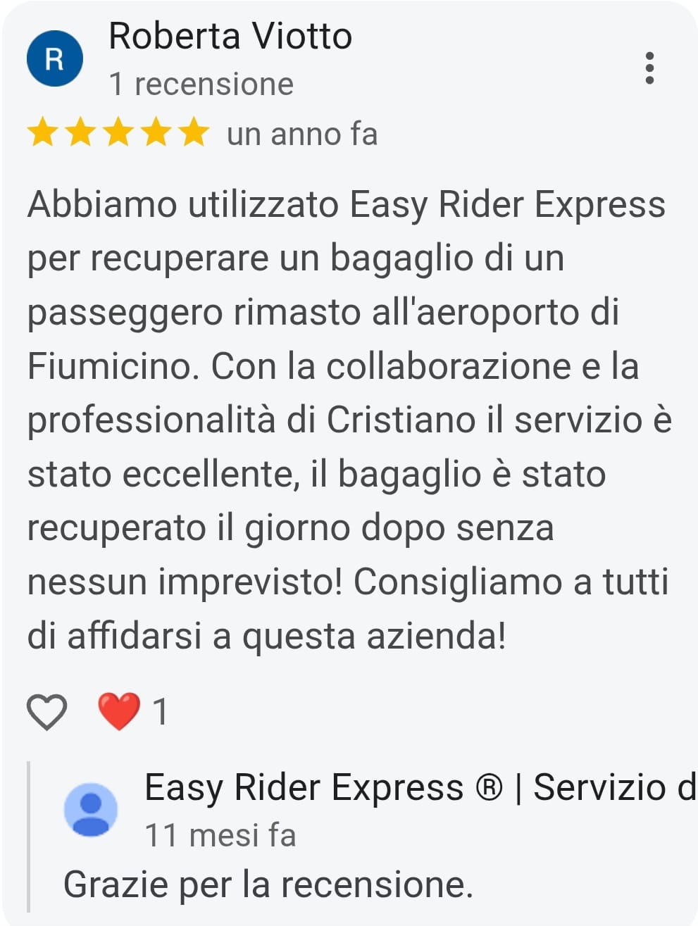 Se stai cercando bagaglio smarrito Fiumicino o supporto per oggetti dimenticati aeroporto, il nostro team segue il recupero bagagli Fiumicino con completa assistenza bagagli Fiumicino fornita da Easy Rider Express.